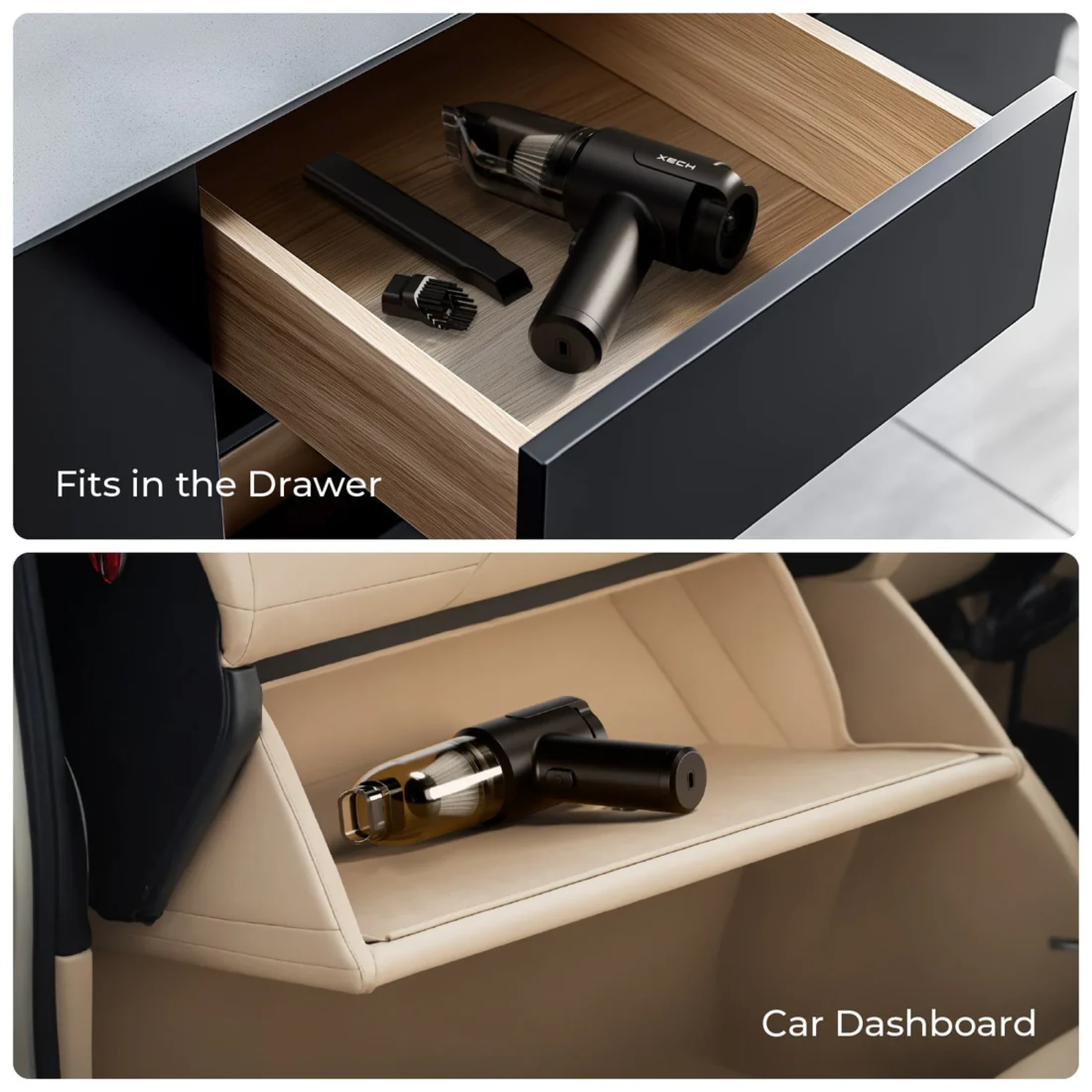 Designed for versatile everyday cleaning, the Xechs’ original merchandise cordless vacuum cleaner with blower delivers powerful 130W performance supported by 9000 Pa suction strength and a high-speed 50000 RPM motor for efficient dust removal across car interiors, home surfaces, and workspaces, featuring a dual vacuum plus blower mode that functions as a compressed air duster for keyboards, vents, and hard-to-reach areas, complemented by a washable HEPA filter that ensures cleaner air output and easy maintenance, while the compact handheld design with a 150 ml dust container and 8.4V rechargeable battery enables lightweight handling and cordless convenience, supported by multiple attachments including crevice nozzle, upholstery brush, focused pipe brush, and mini pipe for precision cleaning, finished with USB charging support and indicator assistance, plus space available for custom logo design printing, making it suitable for car interiors, home cleaning, desk setups, and corporate gifting.