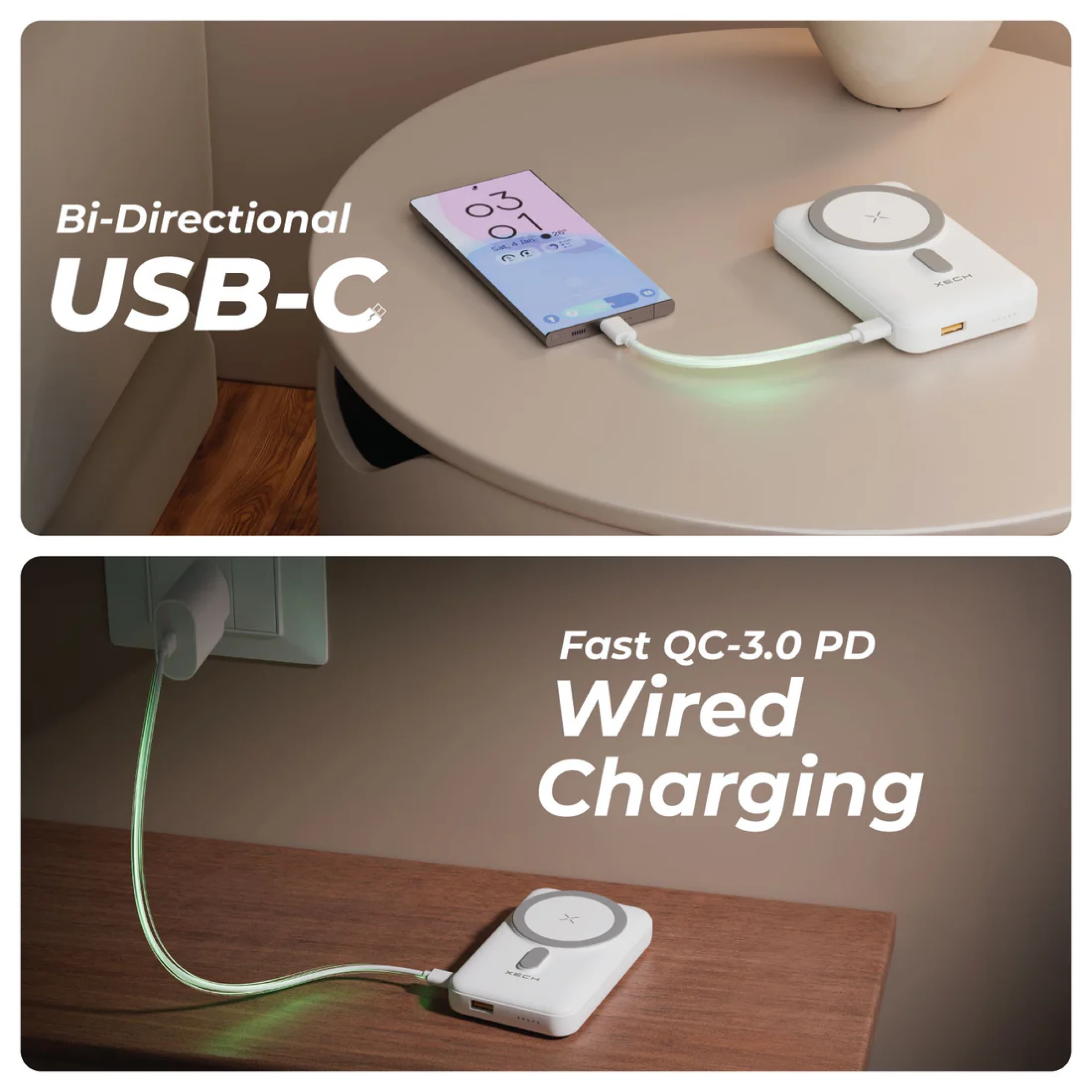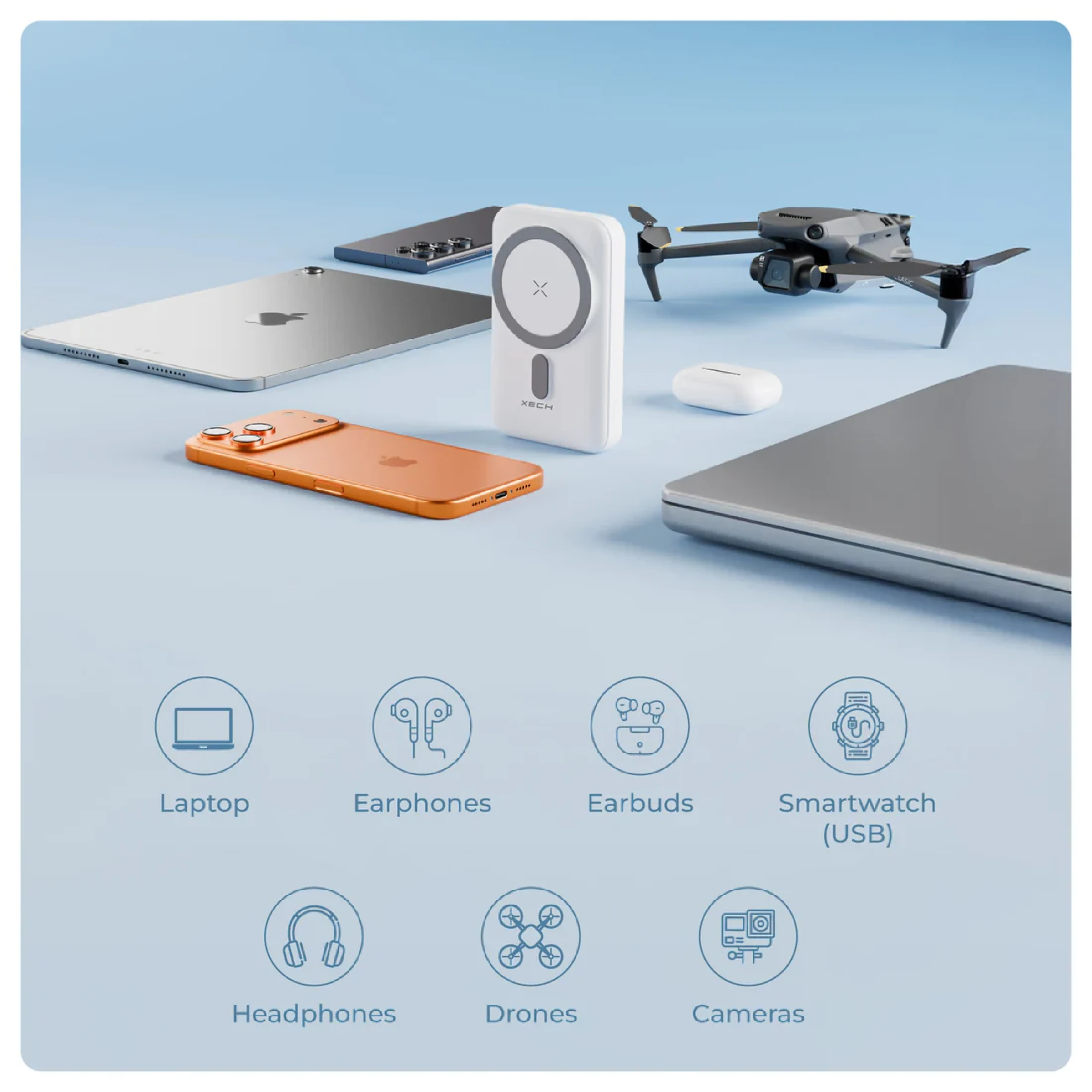 Designed for everyday power needs on the move, Xech original merchandise magnetic power bank delivers dependable charging performance within a compact portable sleek design sized at 7 × 11.2 × 2.3 cm. Massive 10000 mAh capacity supports extended usage while 15W wireless charging plus QC 3.0 PD wired charging ensure flexible power delivery through dual USB output plus bi-directional USB-C port. Powerful rare earth magnets provide secure attachment during use while built-in kickstand for phone holder adds hands free convenience. LED battery indicator keeps power status visible at all times. Clean exterior surface offers space for custom logo printing plus design branding, making it suitable for corporate gifting, students, professionals plus festive giveaways.