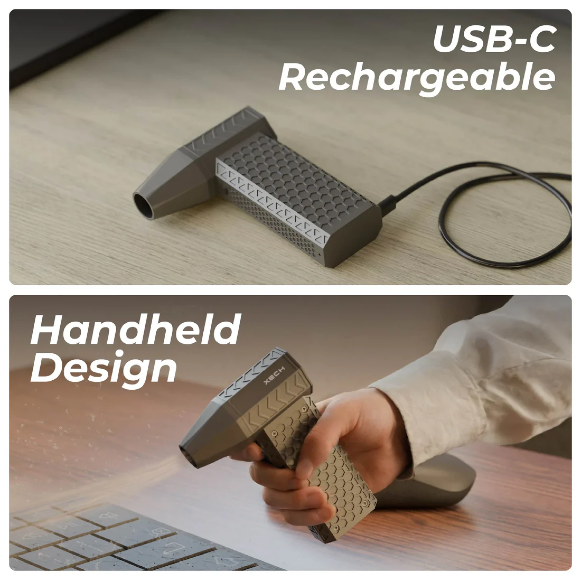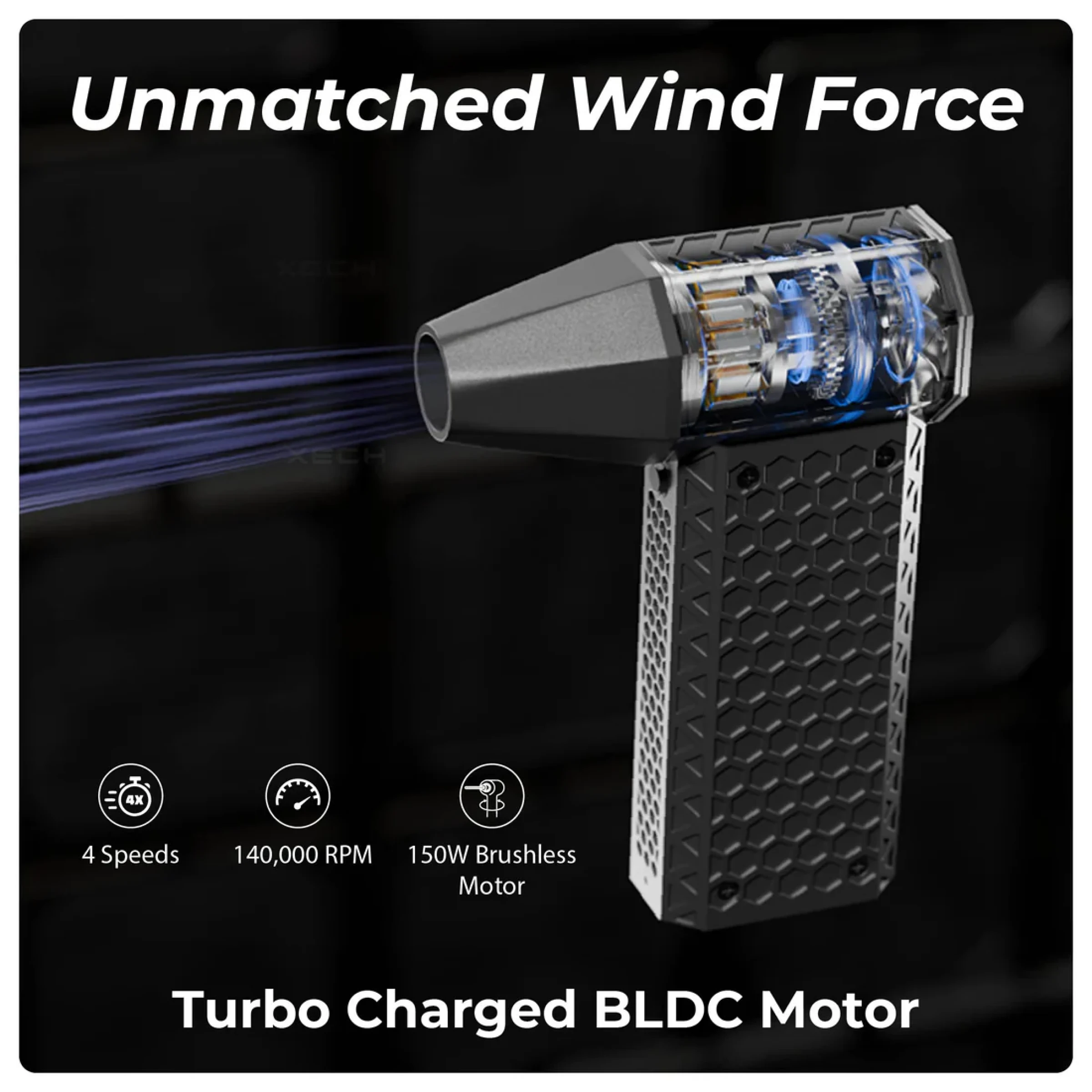 Designed for precision air cleaning, the Xechs’ original merchandise high speed air duster delivers unmatched wind force through a turbo charged BLDC motor with 150W brushless output and motor speeds reaching up to 140000 RPM for powerful dust removal across car interiors, window panes, keyboards, cameras, and electronic equipment, featuring four speed control levels that allow adjustable airflow intensity based on cleaning needs, built with a turbo fan airflow system that generates strong 130 g wind thrust while maintaining stable performance, complemented by an ergonomic handheld design with a lightweight body, one button power control, and honeycomb exterior for secure grip, supported by USB-C rechargeable convenience with LED charging indicator and efficient cooling through air intake vents, finished with space available for custom logo design printing, making it suitable for home use, office desks, professional setups, and corporate gifting.